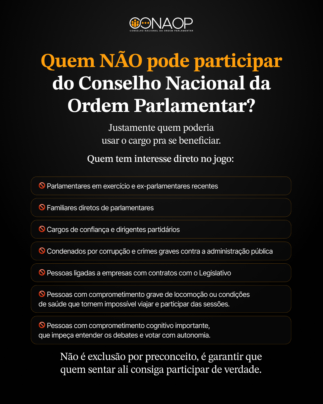 Importante: o CONAOP não cria impostos, nem legisla sobre educação, saúde, segurança etc. Ele cuida somente das regras internas dos parlamentares.